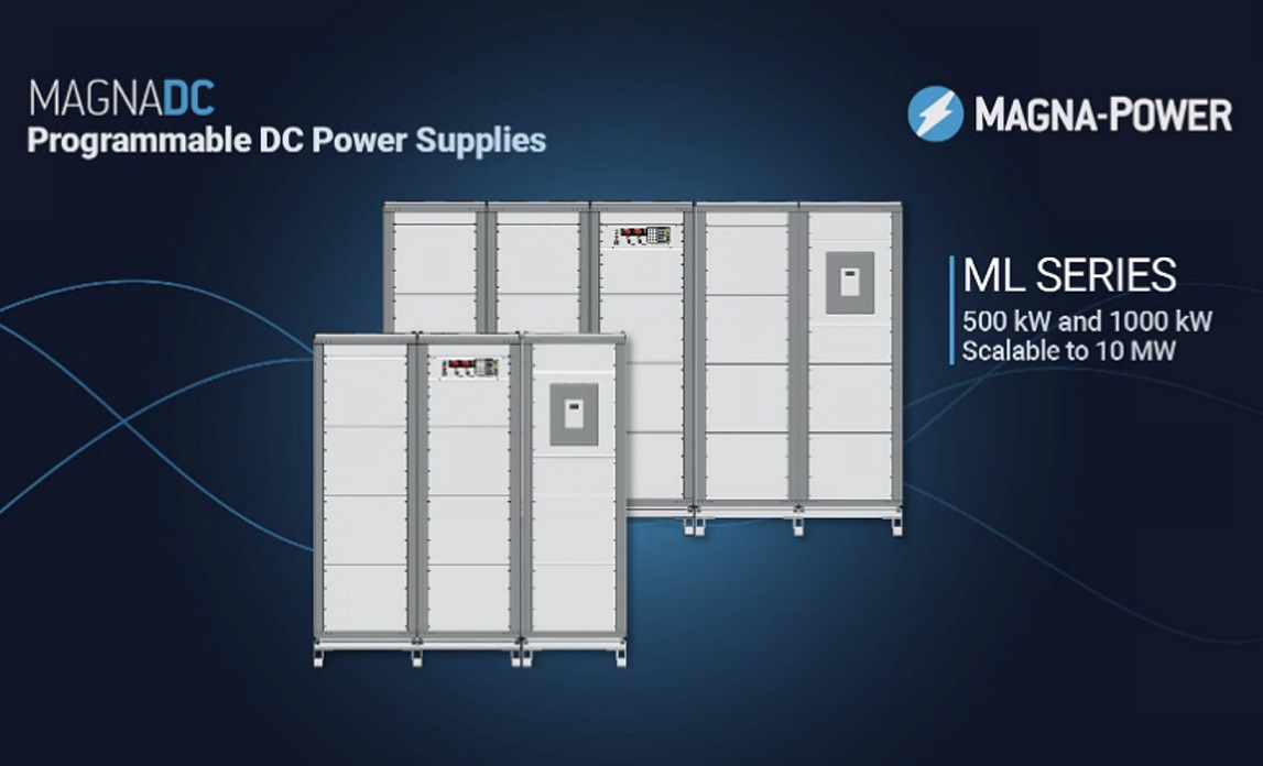Magna-Power released the ML Series, a water-cooled programmable DC power supply offering 500 kW and 1 MW models, significantly increasing power density and reducing size for high-power applications.